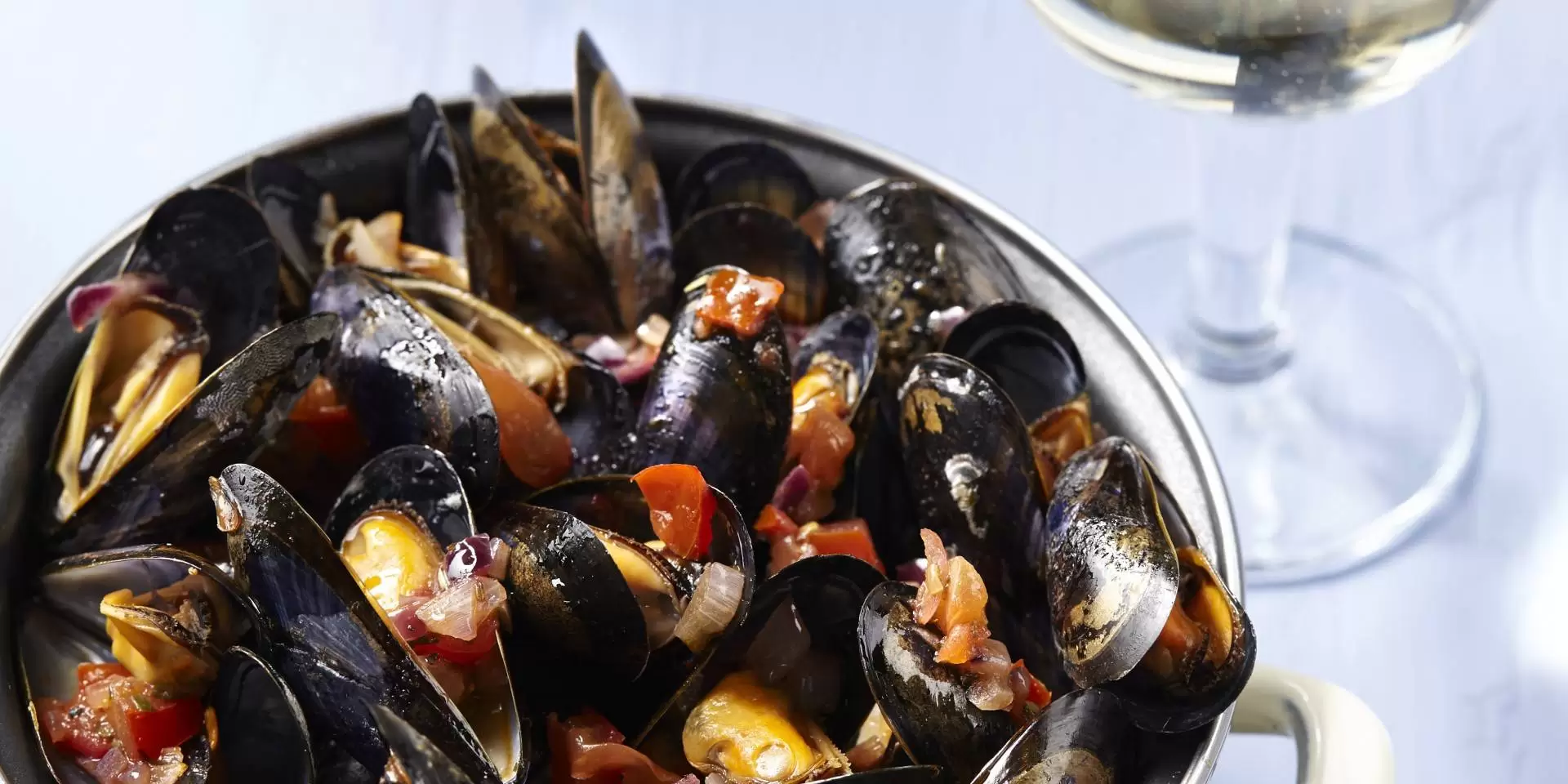 Giet het tomatenmengsel over de mosselen, schud even op en serveer met brood.